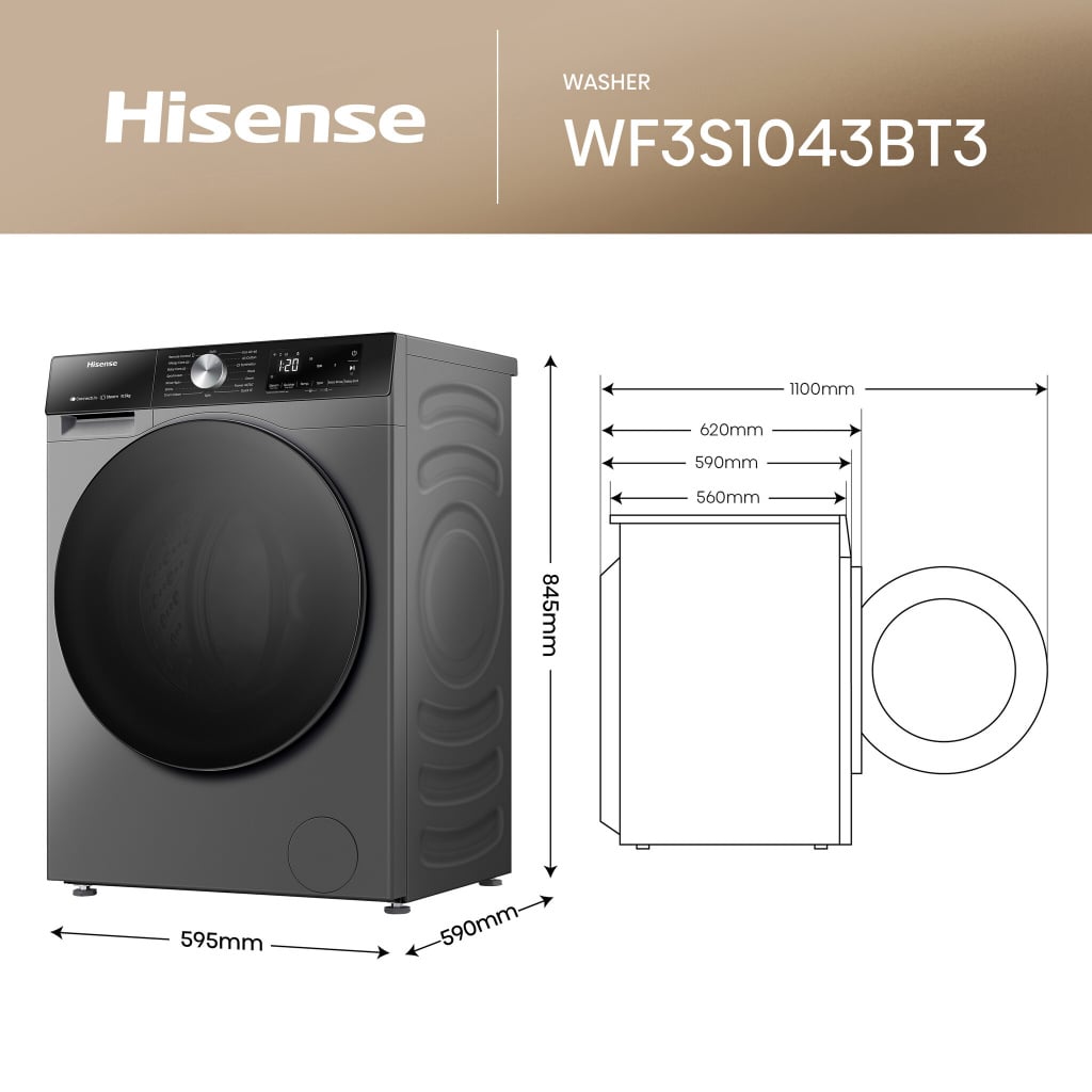 Hisense 3S Series WF3S1043BT3 10.5kg, 1400 Spin, Steam Washing Machine – Titanium – A Rated