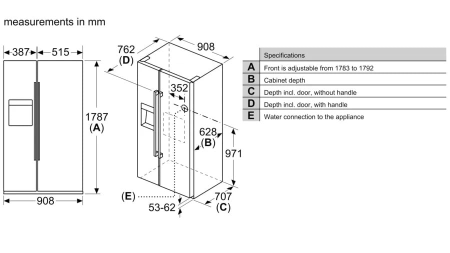 371/191 l, 323 kWh/annum, 42 dB, 1787 x 908 x 707 mm, 114 kg, SN-T, 220 – 240 V